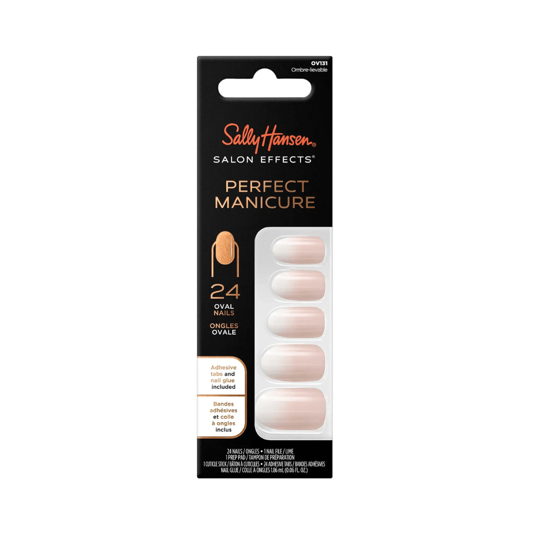 Bring home the salon with Sally Hansen Salon Effects® Perfect Manicure™! Elevate your look with flawless, ready to wear nails. With Sally Hansen Salon Effects® Perfect Manicure™ you don't need to be born with beautiful nails to have them! Premium, natural looking nails, curated with on-trend nail designs, classic Sally Hansen colors and desirable nail lengths. Packaged in a unique 'try me on' carton and comes complete with 24 nails, nail file, wooden stick, prep pad, adhesive tabs and nail glue.