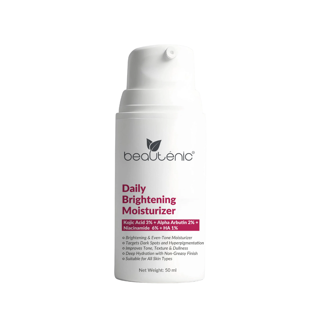 Beautenic Daily Brightening Moisturizer is a clinically formulated, lightweight moisturizer created to target dullness, uneven skin tone, and persistent dark spots. With Kojic Acid 3%, Alpha Arbutin 2%, and Niacinamide 6%, it works to visibly fade pigmentation while restoring clarity and brightness. Hyaluronic Acid 1% ensures deep hydration, leaving skin soft, supple, and refreshed. Gentle yet effective, it is ideal for daily use, making it the best brightening moisturizer in Pakistan for those seeking an even, radiant complexion.