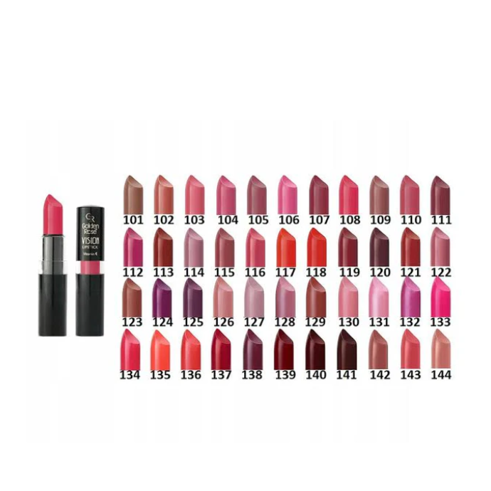 Golden Rose Vision Lipstick line provides pretty look on your lips for hours. Soft and creamy textured colors glides on easily, gives lightweight feel, delivers rich and lustrous finish on your lips.Its paraben free Formula contains nourishing and moisturizing agents Shea Butter,Jojoba Oil and Vitamin E. It has creamy and pearly 44 shades in new color view lipstick case.